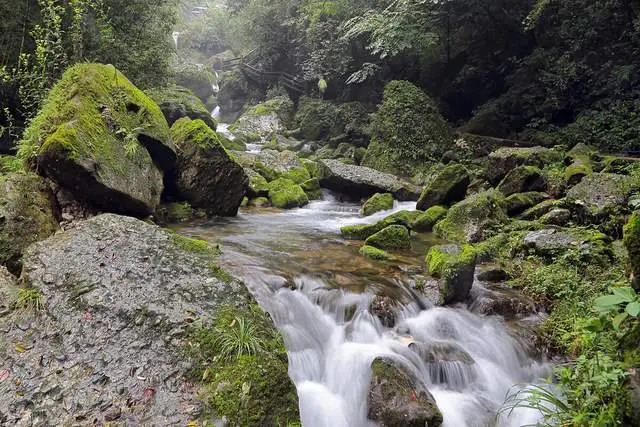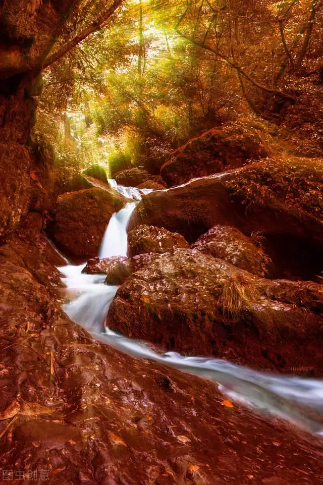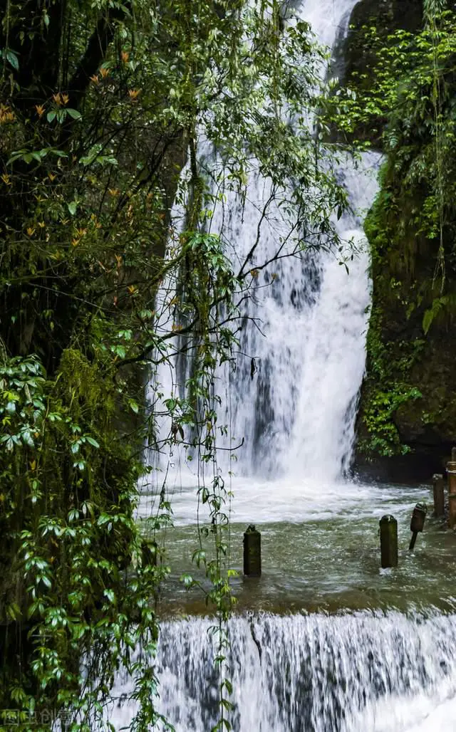 那天正是雨后初晴,树叶滴水,苍岩流泉。日光穿过郁郁葱葱的翠林,照在石板道上,紫烟缭绕,扑朔迷离。沿着石阶进山,不时有“凝翠”、“云巢”、“天然图画”等石刻,映入眼帘。往上走到青龙岗下,我们在一座朴拙的桥亭里休息,真正领略到了“苔深不雨山常温,林静无风暑自消”的意境。