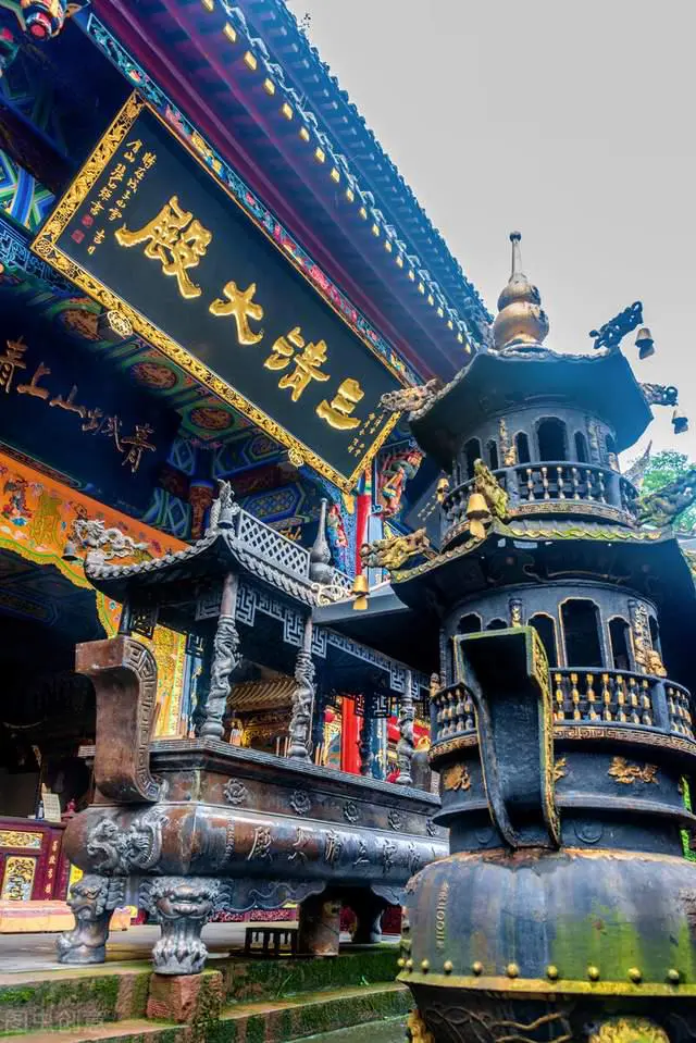 三清大殿是天师洞的主殿,为重檐歇山顶楼阁式建筑。建于1923年。殿前通廊九级石阶,前檐排列六根大石圆柱,立在高1.2米雕工精致的石狮、麒麟和独角兽柱础上。殿堂横列5间,共580平方米,重檐飞檐,古朴宏伟。