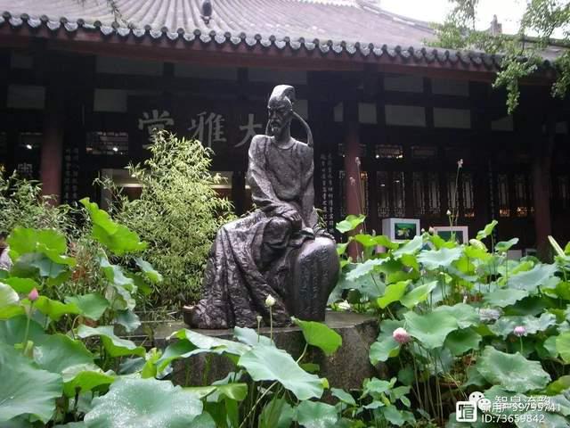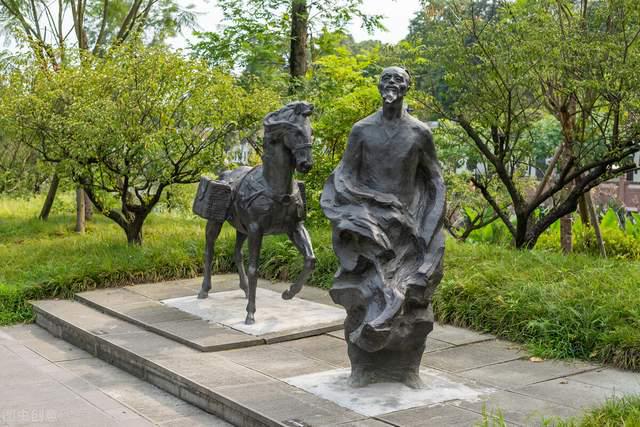我们入草堂大门,依次参观了大廨、诗史堂、工部祠三重古雅的厅堂。大廨是座通堂式的敞厅,厅前两株合抱的黄桷树,枝繁叶茂,浓荫蔽地。所谓“廨”,即官署,古代官吏办公之所。大廨既为象征性的办事之处,当然设有桌椅几案、文房四宝之类的陈列。今日我们在此所见,屹立正中的是著名的雕塑家余痒先生所塑的杜甫像。诗人一副饱经忧患的清浊面容,拈须沉吟,仿佛满腔忧国忧民之情正待抒发。